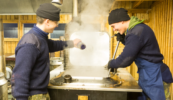Ensimmäisen vuosikurssin kadettien sekä varusmiesten muonituksesta vastaavat yhdessä Leijona Cateringin kanssa Merisotakoulun neljä laivakokkia. Matruusi Cristobal Lundelin ja ylimatruusi Otto Seppäläinen ovat mukana huolehtimassa, että harjoituksissa olevat kadetit saavat lämmintä ruokaa. Heillä oli hyvin selkeä näkemys muonituksen tärkeydestä: